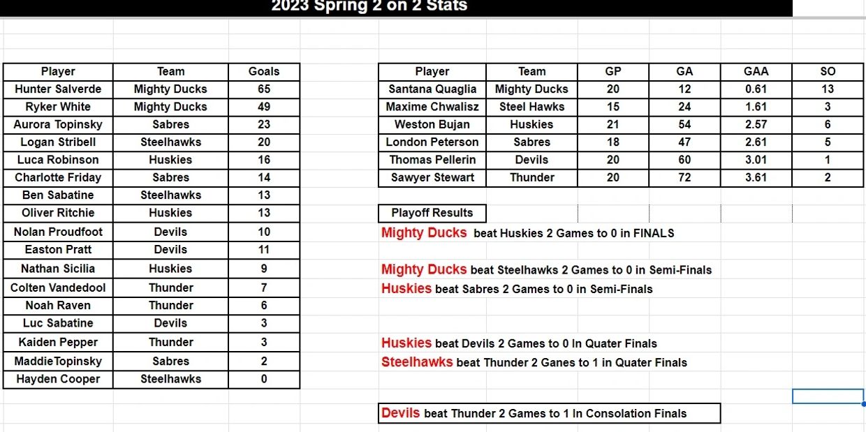 The Mighty Ducks showed why they were the favorite going into Playoff Weekend, sweeping both the Semi's and Finals on their way to capturing the On Ice CUP for the 2023 Spring Campaign. The Ducks proved to be too much to handle for the Huskies in the Finals dropping the decisive game 4-1. The Huskies; 4th place in Regular Season; surprised the heavily favored Sabres in the Semi-Finals, but couldn't finish the storybook ending. The Playoff weekend highlights didn't stop there, after going winless in the Regular Season, the Thunder found their game and grabbed 2 wins as they dropped a closely contested 1st Round Playoff match up with the heavily favored Steelhawks team. Sawyer Stewart was sensational in net allowing only 7 goals in 5 Playoff Games.